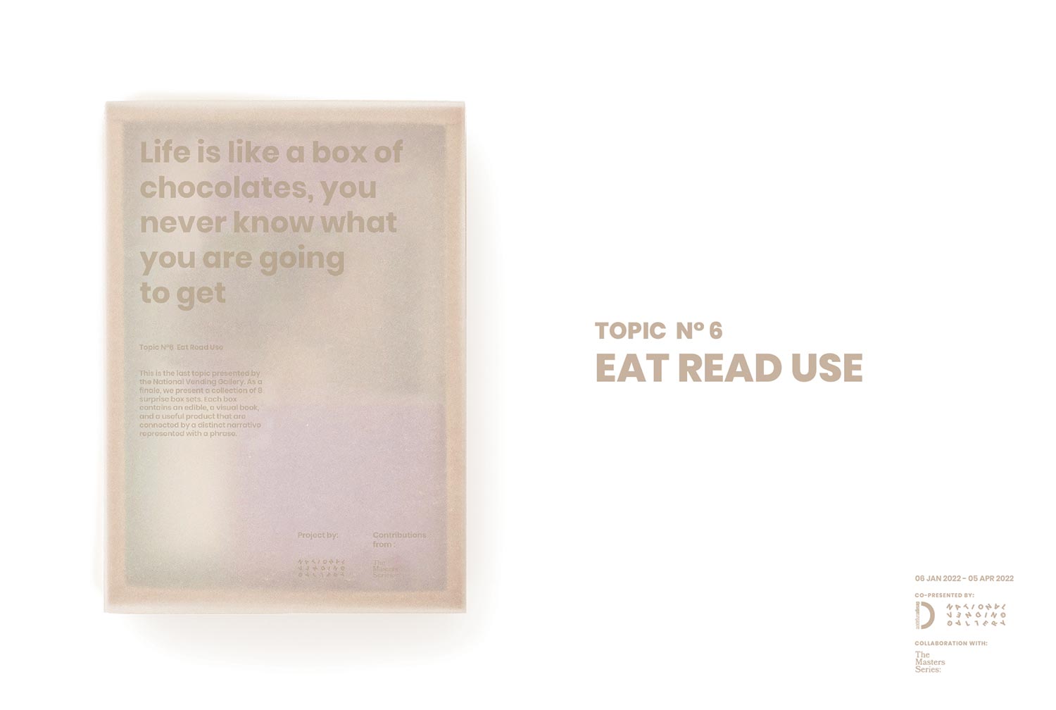“Life is like a box of chocolates, you never know what you are going to get.” National Vending Gallery presents its last topic: No. 6 Eat Read Use, a collection of 8 surprise box sets. Each box contains an edible, a visual book, and a useful product that are connected by a distinct narrative represented with a phrase. Kombucha, a game set, a household product – who knows what surprises are in store for you. Don’t miss this delicious finale.