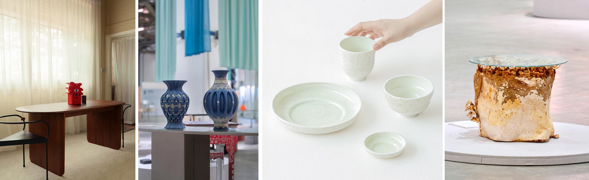 From left to right: PIE Dining Table, by Nathan Home; Threads of Becoming, by Melvin Ong, Shervon Ong and Andy Yeo; Incinerated Ware by Sophia Chin; and Weight of Nothingness by Bewilder. Photos courtesy of the designers.